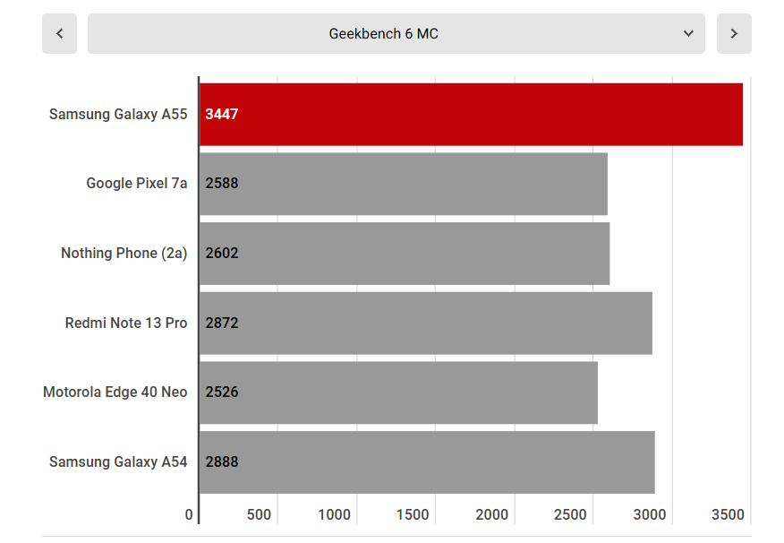 بالمقارنة مع منافسيه، يتفوق هاتف Galaxy A55 5G بسهولة على هاتفي Nothing Phone (2a) وGoogle Pixel 7a في اختبارات أداء وحدة المعالجة المركزية، ولكنه أقل منهما قليلًا من حيث وحدة معالجة الرسومات.